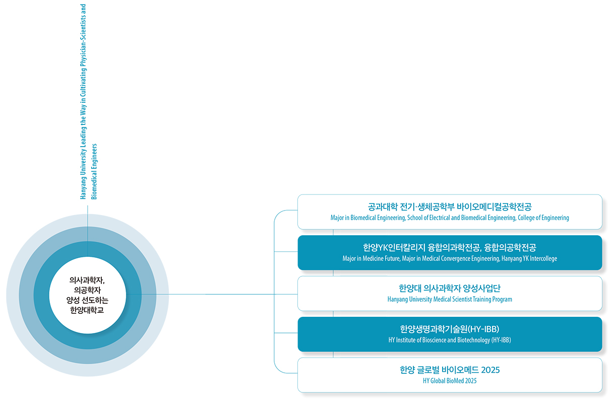 The United States has been running physician-scientist training programs led by federal agencies such as the National Institutes of Health (NIH) since as early as the 1960s. It is estimated that approximately 1,700 people—about 4% of annual medical school graduates—choose a career as physician-scientists each year. In contrast, Korea has a significant shortage of physician-scientists, and the field of biomedical engineering also requires more systematic and proactive support. Here, we introduce the steps that Hanyang University has steadily taken to cultivate talent for the future medical and bio sectors.